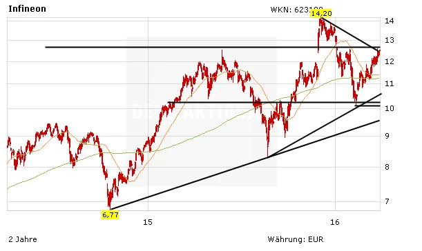Selbst wenn Infineon nicht mehr so viele Computerchips etwa an Volkswagen verkauft, nehmen andere Autokonzerne diese Produkte ab, denn die Fahrzeugbranche ist noch im Aufwind. Zudem verbessert sich das Chartbild stetig. Deshalb bleibt DER AKTIONÄR dabei, Anleger sollten die Aktie mit einem Kursziel von 14 Euro weiter kaufen und ihr Investment bei 9,80 Euro absichern.