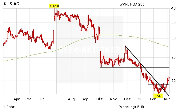 Während sich der Kurs in den vergangenen Monaten stets verbilligte, gab es keinen Aktienkauf von Norbert Steiner oder einem seiner vier Kollegen aus dem Spitzenvorstand. Laut insiderdaten.de gab es in den vergangenen Monaten nur vier eher kleinere Insiderkäufe. Dass hier also selbst Kurse von teilweise unter 20 Euro nicht zum Einstieg genutzt werden, ist eigentlich vollkommen unverständlich. Es wäre doch nun endlich einmal an der Zeit, dass die Vorstände den gebeutelten Anteilseignern mit eigenen Taten – und nicht nur mit Worten – beweisen, dass auch sie von zukünftig höheren Kursen der K+S-Aktie überzeugt sind.