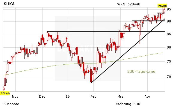 Von 93,50 Euro auf nun 95,80 Euro steigerte der MDAX-Titel seine Bestmarke. Damit liegt das stärkste aller Kaufsignale vor, denn alle investierten Anleger liegen im Plus. Verständlich, dass die 200-Tage-Linie bei 78,22 Euro weit unter dem Papier liegt. Sollte sich der Gesamtmarkt jedoch eintrüben oder KUKA die Investoren mit den Quartalszahlen am 4. Mai enttäuschen, dann geben dem Titel zwei Unterstützungszonen Halt. Die erste befindet sich bei 90 Euro und die zweite im Bereich des Ausbruchsniveaus bei 86 Euro.