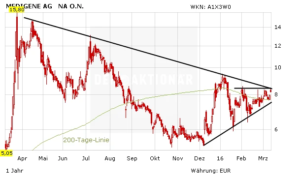 Nach Ansicht des Biotech-Report ist Medigenes einzigartige TCR-Bibliothek der neue Goldstandard der Immuntherapie. Der Titel könnte sich daher langfristig im Kurs vervielfachen. Da Medigene im Musterdepot des Biotech-Report stark gewichtet ist, erfahren die Leser dieses Informationsdienstes regelmäßig hochinteressante Hintergrundinformationen zu dem Krebsspezialisten. Mehr zu Medigene lesen Sie im nächsten Biotech-Report. Aus charttechnischer Sicht könnte nun der große Ausbruch aus dem horizontalen Widerstand, der seit Februar dieses Jahres ausgebildet wurde und dem langfristigen Abwärtstrend gelingen.