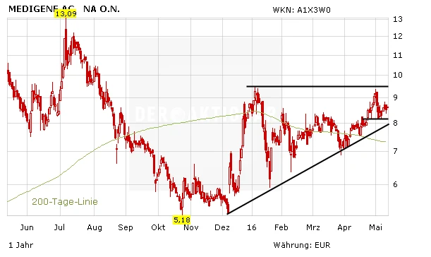 DER AKTIONÄR bleibt optimistisch, was die weitere Entwicklung von Medigene angeht. Zuletzt ist die Aktie zwar am Widerstand bei 9,49 Euro gescheitert. Schon bald könnte aber durchaus insbesondere in Anbetracht der stetig guten Nachrichtenlage ein weiterer Angriff erfolgen. Ein Sprung über diese Marke, würde ein klares Kaufsignal bedeuten. Medigene ist eine der Top-Positionen im Musterdepot des Biotech-Reports (www.biotechreport.de).