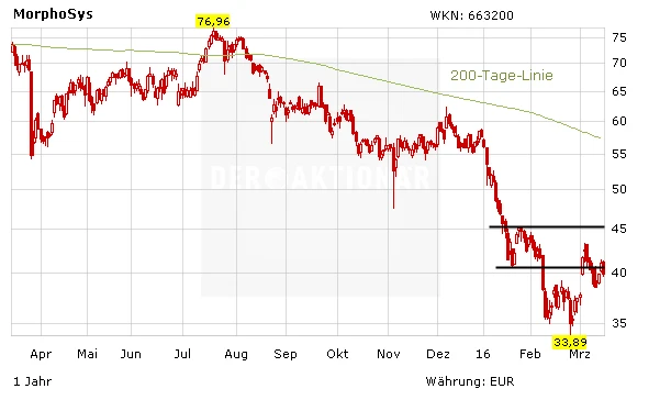 Die Aktie von Morphosys verliert am heutigen insgesamt schwachen Handelstag erneut 2,5 Prozent auf 40,04 Euro. Damit ist der Wert die fünftschwächste Aktie im TecDAX. Lediglich Aixtron, Drägerwerk, Siltronic und Evotec entwickeln sich noch schlechter. Von fundamentaler Seite gibt es bei Morphosys allerdings keinen Grund für die überdurchschnittliche Schwäche. Nach dem starken Tag gestern dürften sich aber wohl einige Anleger heute aufgrund der allgemeinen Marktschwäche wieder davon getrennt haben.
