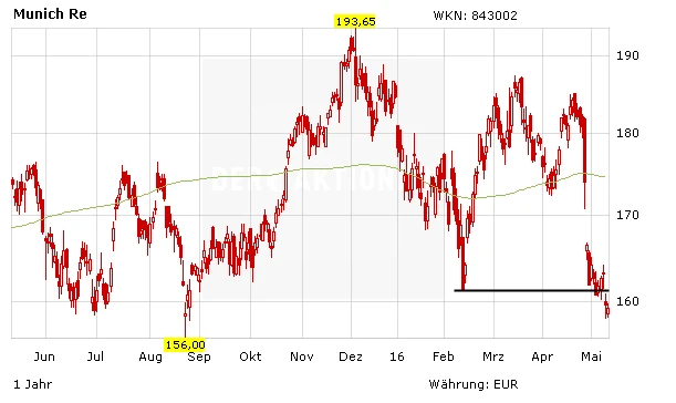 Die Aktionäre des weltgrößten Rückversicherers haben sich vom schwachen ersten Quartal immer noch nicht erholt. Die Aktie befindet sich weiter im freien Fall. Aktuell ist der Titel nur noch einen Hauch vom 12-Monats-Tief bei 156 Euro entfernt. Sehr wahrscheinlich wird diese Unterstützung bald getestet werden. Dann droht ein Absturz in Richtung 148,50 Euro.