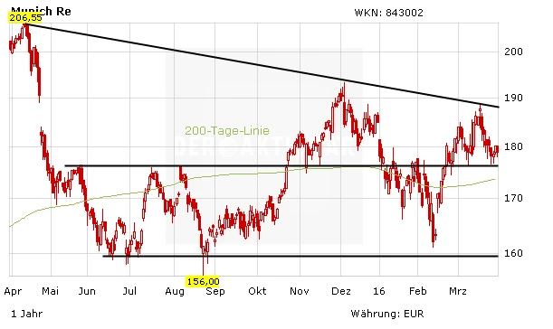 Seit rund zwei Wochen ist die Aufwärtsbewegung bei der Munich Re beendet. Der Rückversicherer ist im Anschluss an die Zahlen zum abgelaufenen Geschäftsjahr unter Druck geraten. Damit setzt sich der Seitwärtstrend, der inzwischen seit fast einem Jahr intakt ist, weiter fort.
