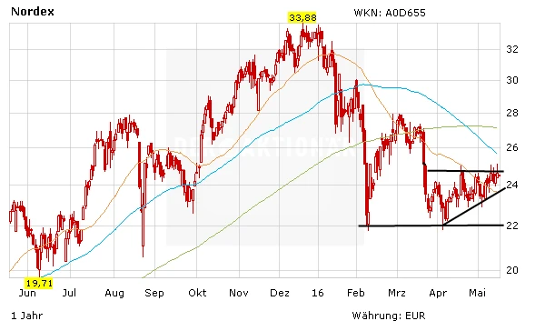Gute News für Aktionäre von Nordex. Die britische Investmentbank Barclays hat die Einstufung für den Windanlagenbauer auf "Overweight" mit einem Kursziel von 32 Euro belassen. Der Umsatz von Nordex im ersten Quartal sei 12 Prozent höher als vom Markt erwartet ausgefallen, schrieb Analyst David Vos in einer Studie.