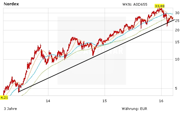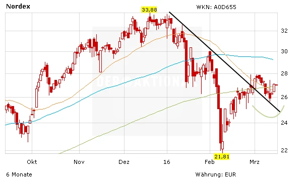 Nach einem kurzen Zwischenstopp derzeit zwischen 26 und 27 Euro sollte Nordex bald wieder nach oben durchstarten und die 200-Tage-Linie deutlich hinter sich lassen. Die Voraussetzungen passen: Der Newsflow ist gut, zudem sollte Ende des ersten Quartals die Übernahme von Acciona Windpower von den Wettbewerbsbehörden genehmigt werden.