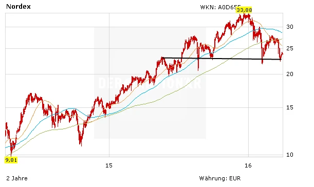 Die Marke von 22,00 Euro stellte sich erneut als solide Unterstützung für die Nordex-Aktie dar. Bereits zum dritten Mal hat das Papier an dieser Marke wieder nach oben gedreht. Damit sollte die Aktie ihr Tief für die nächsten Monate gesehen haben.