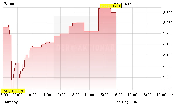 Was für ein Kursverlauf bei der Aktie von Paion am heutigen Tag. Zunächst startete das Papier mit einem Minus von fast 17 Prozent in den Tag. Einzige Meldung allerdings waren die Geschäftszahlen für 2015 und der Ausblick für 2016, die beide keineswegs eine negative Überraschung beinhalteten. Der Jahresfehlbetrag von 28,2 Millionen Euro lag in dem für das Geschäftsjahr 2015 prognostizierten Bereich von 27 Millionen bis 29 Millionen Euro. Wie erwartet sind im Berichtsjahr keine wesentlichen Umsatzerlöse angefallen, aber wichtige Investitionen in die Entwicklung von Remimazolam, ein weit fortgeschrittener Narkosemittelkandidat, geflossen. Paion selbst sieht sich bis ins erste Quartal des kommenden Jahres finanziert.