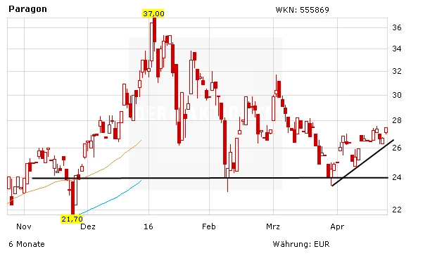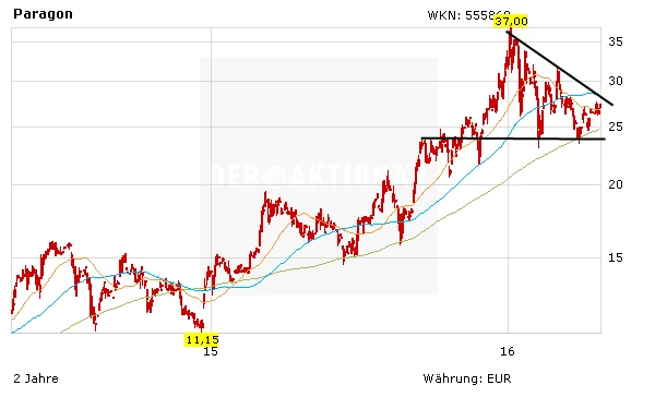 DER AKTIONÄR hat Paragon bereits mehrmals unter der Rubrik HOT STOCK empfohlen. Die Auftragspipeline für die nächsten Jahre ist gut gefüllt. Die Aktie hat in den letzten Wochen wieder den Weg nach oben eingeschlagen. Die Konsolidierung war mit dem Rücksetzer auf 24 Euro beendet. Hier fand das Papier einen starken Widerstand aus dem Februar 2016 sowie dem Monat November 2015. Die Aktie bleibt spannend, ist jedoch nur für Anleger mit einem guten Nervenkostüm geeignet. Nächstes Etappenziel ist die Marke von 30 Euro.