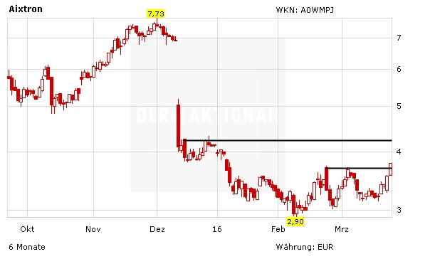 Das Fazit hat Bestand: Aus fundamentaler Sicht bietet sich zwar kein Einstieg bei Aixtron an. Aus charttechnischer Sicht hat sich dennoch eine interessante Formation herausbebildet. Nachdem sich der Kurs der TecDAX-Aktie zuletzt oberhalb der 3-Euro-Marke stabilisieren konnte, wurde im Rahmen einer Gegenbewegung nun auch der Widerstand bei 3,70 Euro überwunden.
