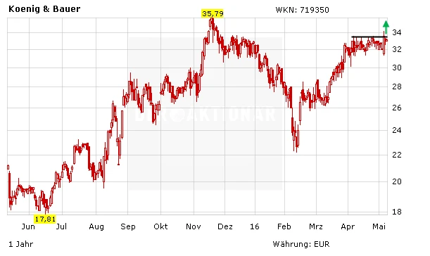 Zur Erinnerung: Die Privatbank Hauck & Aufhäuser hat Koenig & Bauer nach einer Investorenveranstaltung auf "Buy" mit einem Kursziel von 43 Euro belassen. Er sei in seiner Einschätzung bestärkt worden, dass der Druckmaschinenbauer für dauerhaftes Wachstum positioniert sei, so Analyst Henning Breiter. Eggert Kuls von Warburg Research sieht die Aktie sogar erst bei 47,20 Euro fair bewertet. Der Druckmaschinenhersteller habe seine Gewinnentwicklung im ersten Quartal wohl deutlich verbessert, so der Experte.
