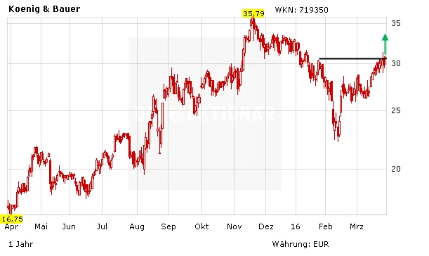 Auch die Analysten sind mit Zahlen und Ausblick zufrieden. Das Analysehaus Warburg Research hat Koenig & Bauer nach Zahlen auf "Buy" mit einem Kursziel von 43,60 Euro belassen. Der Druckmaschinenhersteller habe im vergangenen Jahr besser als erwartet abgeschnitten, was besonders für den starken Auftragseingang gelte, so Analyst Eggert Kuls. Die Experten der Privatbank Hauck & Aufhäuser kommen zu einem ähnlichen Fazit. Der Druckmaschinenhersteller habe ein herausragendes viertes Quartal 2015 hinter sich, so Henning Breiter. Die Unternehmensziele für 2016 erschienen zu konservativ. Breiter hat die Einstufung daher ebenfalls auf "Buy" mit einem Kursziel von 43 Euro belassen.