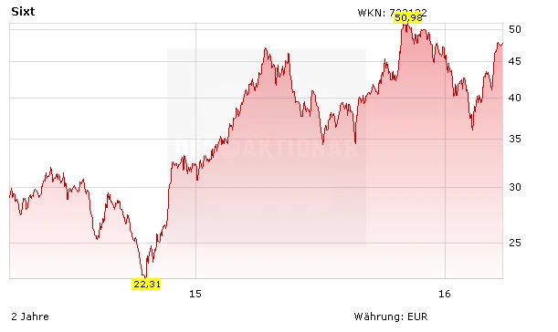 Bei Sixt gibt es eine Reihe von Impulsen, die für nachhaltiges Umsatz- und Gewinnwachstum und steigende Kurse sprechen. Das Vermietgeschäft und die US-Expansion werden dabei die Haupttreiber sein. Die Dienstleistungen wie Carsharing und MyDriver sorgen für zusätzliche Fantasie. Trotz kostenintensiver Internationalisierung legt das Ergebnis nachhaltig zu. Mit dieser Ergebnisqualität kann man auch das im Peergroup-Vergleich recht hohe 2016er-KGV von 18 rechtfertigen. Abgerundet wird das Bild durch eine solide Dividendenrendite von rund drei Prozent. Die gute Laune von Firmenchef Sixt dürfte also noch eine Weile anhalten.