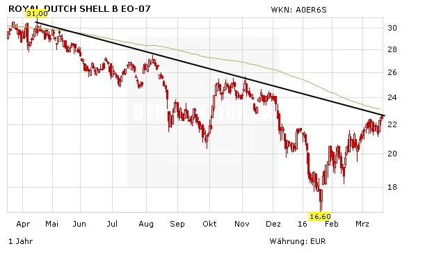 Die Lage bei Royal Dutch Shell hellt sich immer mehr auf. Inzwischen notieren die Papiere des britisch-niederländischen Ölriesen nur noch knapp unterhalb der 200-Tage-Linie. Erstmals seit fast einem Jahr könnte damit auch bei der Euro-Notierung der Sprung über den wichtigen Indikator gelingen. Dies dürfte der Erholungsbewegung weiteren Schwung verliehen.