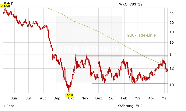 Rückenwind erhalten die Papiere von RWE von der französischen Großbank Société Générale. Analyst Lüder Schumacher hat die Einstufung vor den Quartalszahlen auf „Buy“ mit einem Kursziel von 13,50 Euro belassen. Am kommenden Donnerstag, den 12. Mai, präsentiert RWE seine Ergebnisse. Diese dürften aber kaum beeindrucken, so Schumacher. Er stützt seine Kaufempfehlung deshalb insbesondere auf die geplante Aufspaltung des Konzerns.