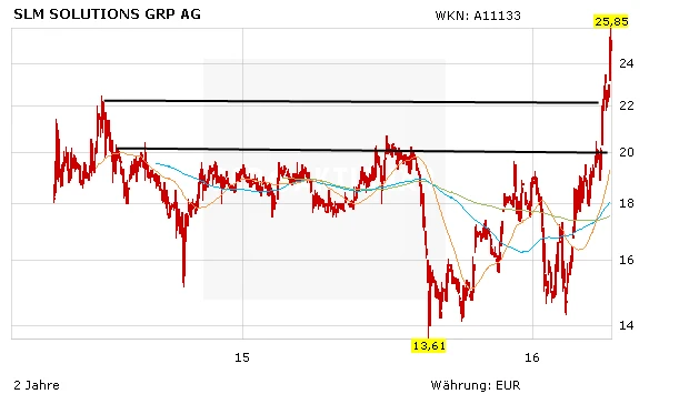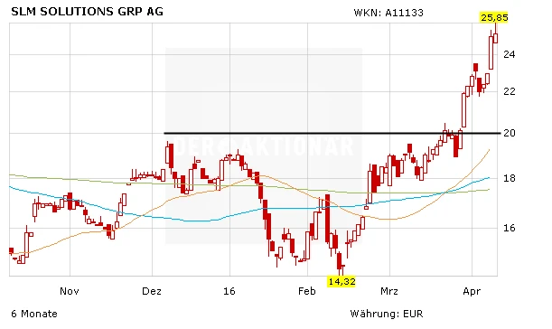 Der Aufwärtstrend der letzten Wochen hat es in sich. Seit Mitte Februar hat die Aktie von SLM Solutions von rund 14,25 Euro auf 25,25 Euro zugelegt. Vor wenigen Tagen hat die britische Investmentbank HSBC eine Kaufstudie mit Kursziel 30 Euro präsentiert. 3D-Metalldruck sei eine revolutionäre Technologie, die starkes Wachstum verspreche, so Analyst Philip Saliba. Der Experte betonte, dass SLM beim 3D-Metalldruck die technologische Führerschaft halte und bis zu viermal schneller produzieren könnte als die Konkurrenten.