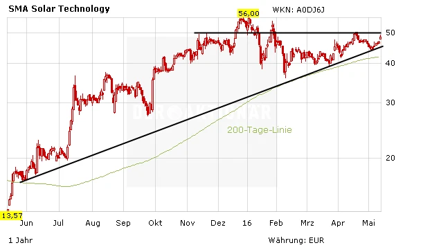 Die Aktie von SMA Solar führt den TecDAX am Donnerstag an. Nach starken Zahlen starten die Papiere des Solartechnik-Herstellers einen neuen Angriff auf die 50-Euro-Marke. Oberhalb dieses Widerstands wäre der Weg bis zum Mehrjahreshoch aus charttechnischer Sicht frei.