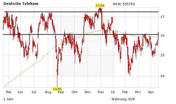 Davon profitiert auch die T-Aktie, die mit einem Plus von rund drei Prozent sowohl den DAX, als auch den Branchenindex übertrifft. Dabei hat der Kurs auch die wichtige 200-Tage-Linie zurückerobert. Nun rückt die obere Begrenzung des mittelfristigen Seitwärtstrend bei 17,50 Euro wieder in den Fokus. Investierte Anleger lassen die Gewinne laufen, Neueinsteiger können nun wieder zugreifen.
