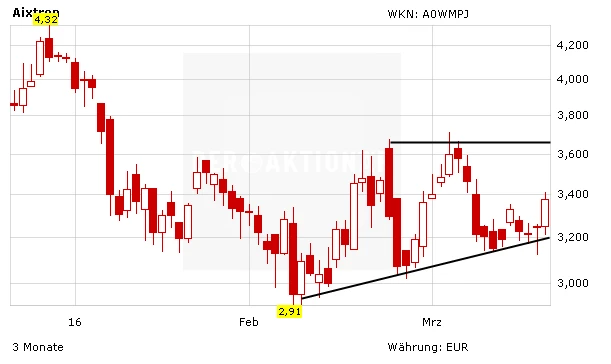 Aus fundamentaler Sicht bietet sich zwar kein Einstieg bei Aixtron an. Aus charttechnischer Sicht hat sich dennoch eine interessante Formation herausbebildet. Nachdem sich der Kurs der TecDAX-Aktie zuletzt oberhalb der 3-Euro-Marke stabilisieren konnte, hat es bereits zwei kurze Aufwärtsimpulse gegeben, die den Kurs stets bis in den Bereich um 3,70 Euro geführt haben. Riskobewusste Anleger setzen mit einer Trading-Position auf einen erneuten Versuch. Ein Stopp bei 3,10 Euro sichert die kleine Position ab.