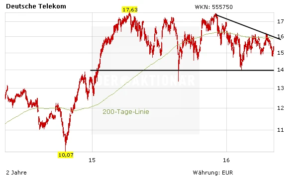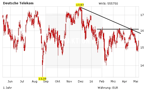 DER AKTIONÄR ist für die T-Aktie ebenfalls optimistisch gestimmt und hält Kurse im Bereich von 20 Euro auf Sicht von zwölf Monaten für realistisch. Ein Stopp bei 13,70 Euro sichert die Position ab. Anleger steigen aufgrund des guten Chance-Risiko-Verhältnisses auf dem aktuellen Kursniveau ein.