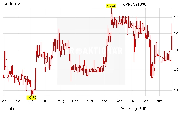 Beim aktuellen Kurs wird Mobotix mit einem KGV von 20 für 2017 bewertet. Den aktuellen Hot Stock der Woche des AKTIONÄR gibt es dagegen für die Hälfte der Mobotix-Bewertung. Die Kurschancen der Aktie sind daher deutlich größer. Zahlreiche Auftragsanfragen von staatlicher Stelle und ein zu erwartender Großauftrag sollten dem aussichstreichen Small-Cap zusätzlichen Schub geben. Der Hot Stock ist heute bereits deutlich angesprungen, ist aber dennoch aussichtsreich. Mehr dazu in der aktuellen Ausgabe 14/2016 von DER AKTIONÄR.
