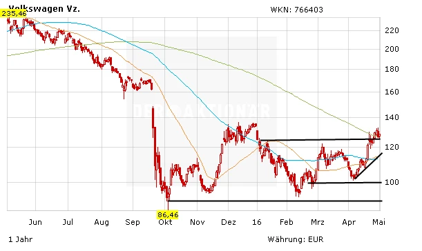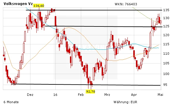 Fakt ist: Die VW-Aktie hat sich in den letzten Wochen wieder aufgerappelt. Von der Unterstützung bei 100 Euro ging es bis auf knapp 130 Euro nach oben. Aktuell konsolidiert die VW-Aktie nahe der 200-Tage-Linie. Das Papier sollte nicht mehr nachhaltig unter diese wichtige Signallinie fallen. Kurzfristig bleibt es dabei: Für Trader besteht Potenzial bis 138 Euro. Hier verläuft ein horizontaler Widerstand. Wird dieser geknackt, ergibt sich für die VW-Aktie weiteres Aufwärtspotenzial.
