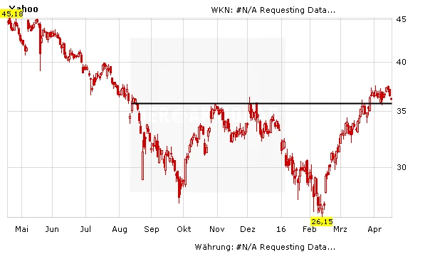 Ungeachtet der weiter anhaltenden Spekulationen, wer letztendlich den Zuschlag zu welchem Kaufpreis erhält, verteidigte das Papier in den vergangenen Tagen die Unterstützungszone bei 35,72 Dollar. Zudem legt Yahoo morgen nach US-Börsenschluss seine Q1-Zahlen (Analystenschätzung: Gewinn von 0,08 Dollar je Aktie