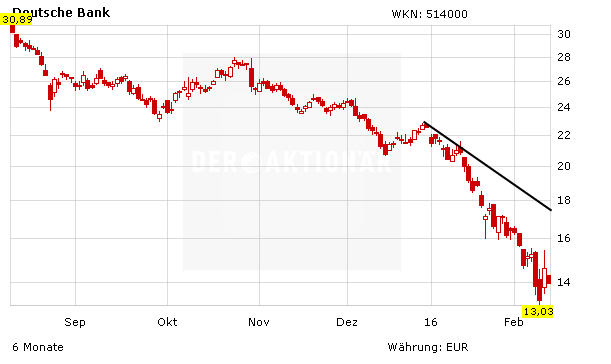 Ihre Kursziele gesenkt haben die Experten aus dem Hause der DZ Bank und der US-Investmentbank Morgan Stanley. Morgan-Stanley-Analyst Huw van Steenis hat den fairen Wert der Aktie von 22,10 auf 18,80 Euro reduziert, aber die Einstufung auf "Equal-weight" belassen. Aufgrund des negativen Börsenumfelds, niedriger Zinsen und der milliardenschweren Belastungen aus Rechtsstreitigkeiten und Strafzahlungen sei die Bank weiter denn je von den mittelfristigen Eigenkapitalanforderungen laut van Steenis entfernt. In seinem Bewertungsmodell habe er einen Dividendenausfall bis 2018 berücksichtigt.
