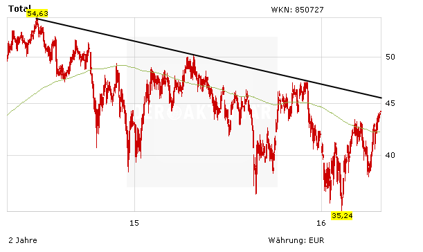 Die Produktion hat Total wegen hoher Nachfrage nach Benzin und Schmierstoffen im ersten Quartal um vier Prozent erhöht. Die stark gesunkenen Preise ließen den Umsatz dennoch um mehr als ein Fünftel auf 32,8 Milliarden Dollar absacken. Unterm Strich blieben 1,6 (Vorjahr 2,7) Milliarden Dollar als Gewinn übrig. Die Dividende für das Quartal hält der Konzern im Vergleich zum Vorquartal wie erwartet stabil bei 0,61 Euro je Aktie. Für das Gesamtjahr würde sich damit eine Dividende von 2,44 Euro je Aktie errechnen, woraus sich eine Rendite von 5,5 Prozent ergibt.