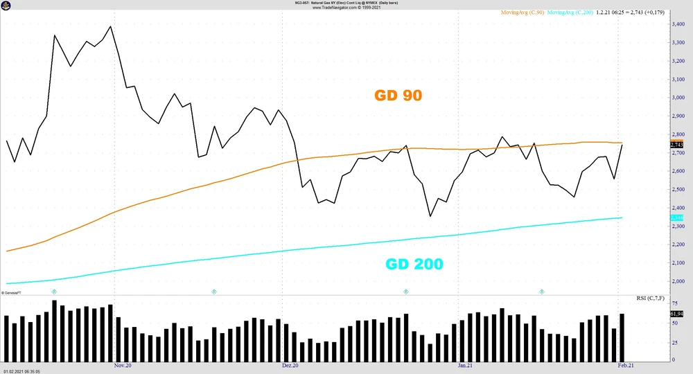Als Reaktion eröffnete NatGas Sonntagnacht an der Futures Börse CME mit einem Gap-Up von knapp sieben Prozent und handelt wieder über 2,70 Dollar. Seit Anfang des Jahres befindet sich NatGas in einem Aufwärtstrend, ALGOreport Leser sind seit 2,587 Dollar long, die nächsten Ziele sind die Höchststände vom 12. Januar bei 2,85 Dollar. Im Bereich von 3,00 Dollar verläuft der 200er-Moving-Average, der auch einen größeren Widerstand darstellt.