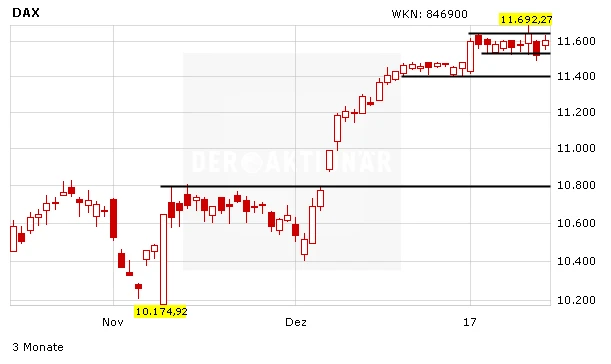 Auf der Oberseite gibt es zwischen 11.637 und 11.692 Punkten eine Reihe von Hürden, die es zu überwinden gilt. Wichtig für eine Fortsetzung der im Dezember gestarteten DAX-Rallye ist ein Ausbruch über das jüngste Verlaufshoch bei 11.692 Punkten. Im Anschluss dürfte es schnell bis 11.800 Zähler gehen, dem Hoch vom Sommer 2015.