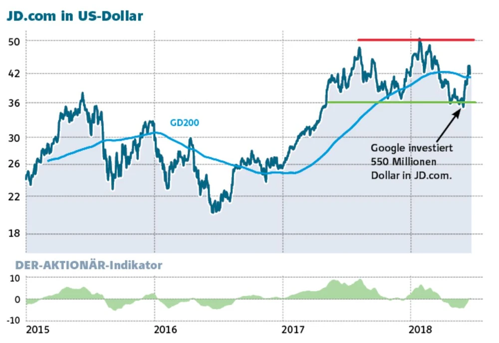 JD.com ist neben Alibaba und Baidu eine der größten und spannendsten Storys im chinesischen Internet. Die Aktie ist zuletzt stark gelaufen, auch, weil Google mit 550 Millionen Dollar bei den Chinesen eingestiegen ist. Das Ziel? Klar, den E-Commerce weiter ausbauen und das Cross-Border-Geschäft vorantreiben. Trotz des Aufschwungs ist das Papier nicht teuer: Die JD.com-Aktie wird aktuell mit dem einfachen Umsatz und KGV (2019e) 34 gehandelt. Anleger sollten an schwächeren Tagen zugreifen.