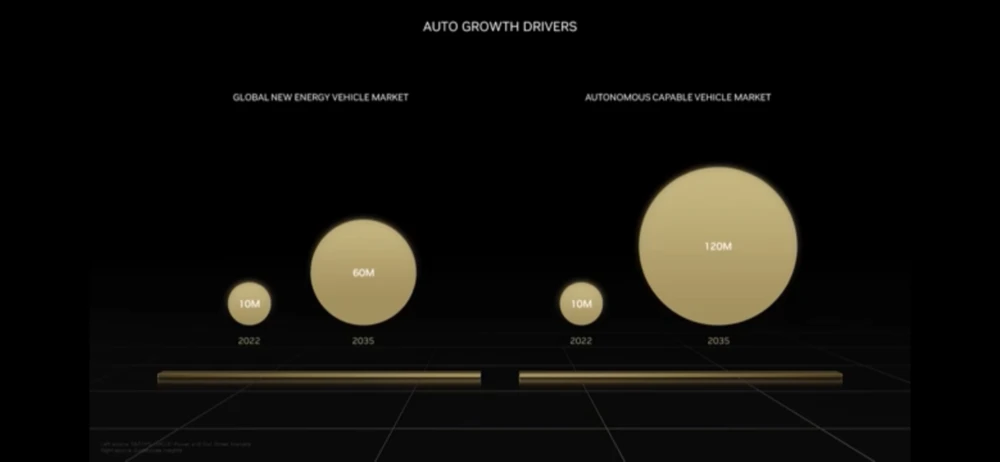 Auf der CES verwies Nvidia jünst auf die Chancen des Selbstfahrens. Mercedes oder BYD setzen etwa auf das Know-how der US-Amerikaner. Neue Berichte gibt es zu Nvidia-Gaming-Funktionen in BYD- und Polestar-Autos. Bereits bekannt ist, dass BYD ab 2023 einen Teil seiner Fahrzeuge mit der Plattform Nvidia Drive Hyperion ausstatten will. Diese sind mit einer Sensorsuite ausgestattet, die über Kameras, Radar- und Ultraschallgeräte verfügt. Das Wachstum ist immens: Bis 2035 wird sich der Nvidia-Grafik zufolge die Anzahl der Autos mit Roboter-Funktionen von 10 auf 120 Millionen mehr als verzehnfachen.