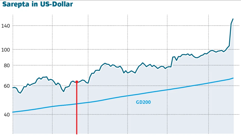 Leerink Partners sieht die Sarepta-Aktie nach den spektakulären Daten bei 196 Dollar fair bewertet (vorheriges Kursziel 121 Dollar). Mit den Daten sei die Erfolgswahrscheinlichkeit deutlich gestiegen. Leerink beziffert diese nun auf 65 Prozent, im vorherigen Bewertungsmodell kalkulierten die Analysten mit einer Quote von 30 Prozent.