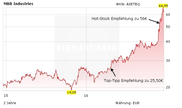 Passend zum diesjährigen Eigenkapitalforum 2017 hatte Nesemeier wieder gute Nachrichten im Gepäck: Die förmlich explodierende Nachfrage nach Elektromobilitätslösungen, insbesondere Motorwickelmaschinen und voll automatisierten Fertigungslinien, führt zu außerordentlichen Auftragseingängen bei Aumann. Nesemeier hat die Zeichen der Zeit rechtzeitig erkannt: Die Maschinenbaukapazitäten wurden neu strukturiert und die MBB Fertigungstechnik und die Aumann-Gruppe zusammengeführt. Nach den organisatorischen Anpassungen der Gesellschaftsstrukturen wird MBB 93,5 Prozent an der schuldenfreien Aumann AG halten, der Rest entfällt auf den früheren Eigentümer Ingo Wojtynia, der weiter Geschäftsführer ist. Zudem stellte Nesemeier einen möglichen Börsengang der Aumann AG in den Raum. Die MBB-Aktie zündete den Turbo und schoss innerhalb weniger Tage auf ein Rekordhoch von 70,31 Euro. DER AKTIONÄR legte rechtzeitig nach und empfahlt die Aktie bei Kursen um 56 Euro als "Hot-Stock" erneut zum Kauf.