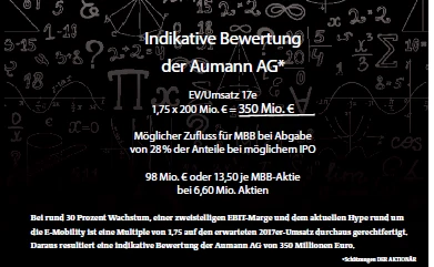 DER AKTIONÄR den Taschenrechner gezückt und den Wert der neuen Aumann AG mit 350 Millionen Euro ermittelt (siehe Rechnung oben). Traditionell dürfte MBB die Mehrheit von rund 60 Prozent an der Tochter behalten. Berücksichtigt man die Verwässerung einer wahrscheinlichen Kapitalerhöhung im Vorfeld des IPO, könnten also knapp 30 Prozent der Anteile an die Börse gebracht werden. In diesem Fall würden MBB rund 100 Millionen Euro in die Kassen gespült. Zusammen mit dem aktuellen Cash-Bestand von 58 Millionen Euro hätte die Gesellschaft damit reichlich Power für gezielte Zukäufe auch zur Stärkung der Kapazitäten bei Aumann. Zudem dürfte ein Teil der Millionen zum Kauf eigener Aktien eingesetzt werden.