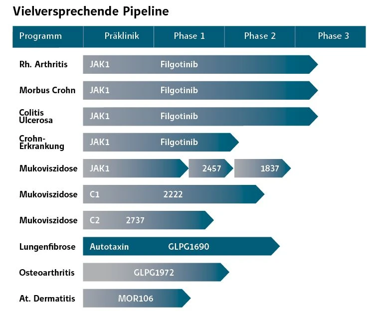 Den Löwenanteil der Pipeline nimmt nach wie vor Filgotinib ein. Dieser JAK-Inhibitor durchläuft derzeit diverse Phase-3-Studien und wurde an Gilead auslizenziert. Ohnehin werden die Amerikaner als potenzieller Käufer für die belgische Biotech-Schmiede gehandelt. Denn mit gut 13 Prozent ist Gilead der größte Galapagos-Einzelaktionär.