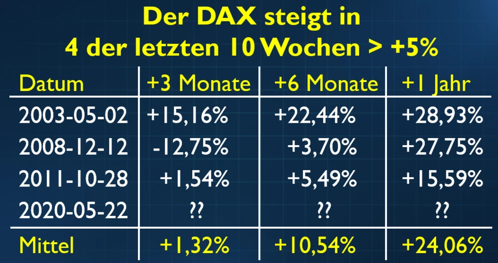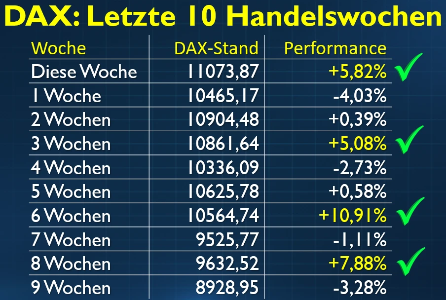 Der DAX hat damit vier der letzten zehn Handelswochen mit Kursgewinnen oberhalb von fünf Prozent abgeschlossen.