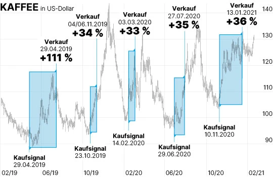 Das hat sich in den vergangenen Jahren mehr als bewährt. Im Fall von Kaffee identifizierte das Tradingsystem den Wert bereits fünf Mal als potenzielle Gewinnchance – immer mit einer sehenswerten Erfolgsquote. Seit Auflegung des Dienstes im Jahr 2019 erreichte Kaffee eine überragende Gesamtperformance von 249 Prozent.