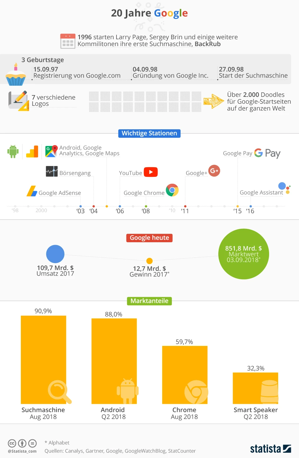 Der Tech-Gigant Google (seit 2015 unter der Dachgesellschaft Alphabet) hat mehr als Grund zum Feiern. Seit genau zwei Jahrzenten ist der Konzern aus dem Silicon Valley einer der ganz Großen und zählt zu den wertvollsten Unternehmen der Welt.