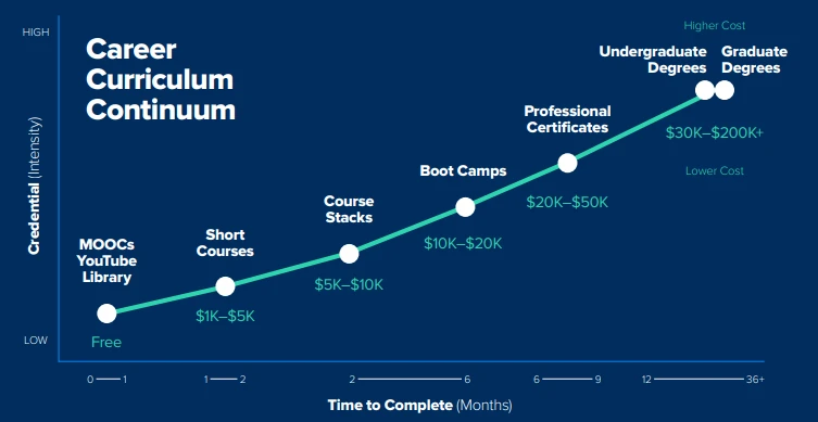 Allerdings hat das Geschäftsmodell von 2U auch einen kleinen Haken, so muss 2U bei jedem Online-Kurs erst einmal in Vorfinanzierung gehen und zudem die laufenden Kosten für die technische Infrastruktur stemmen. Die Höhe der Kosten erstreckt sich dabei nach dem angestrebten Abschluss des Kurses (siehe Grafik unten) von 1000 Dollar bei einer einfachen Weiterbildung bis hin zu mehr als 200.000 Dollar für einen Hochschulabschluss.