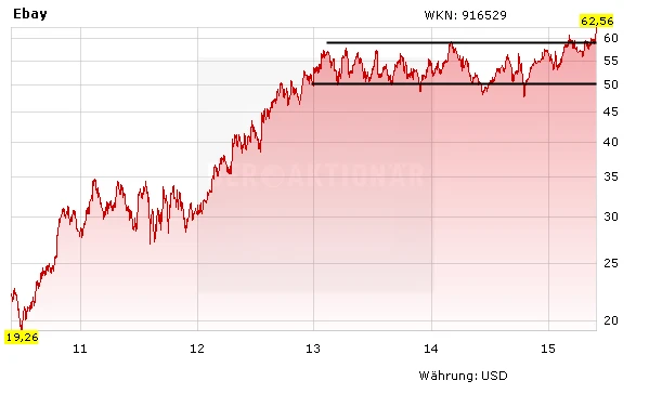 Am Freitag hat sich die Ebay-Aktie an der Wall Street bei 61,36 Dollar ins Wochenende verabschiedet. Gestern schloss der US-Technologieriese bei 62,56 Dollar. Im Hoch ging es zuvor bis auf 63,03 Euro. Damit ist der Kurs auf bestem Weg, aus der sehr langen Seitwärtsrange auszubrechen.