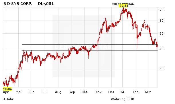 Am vergangenen Freitag erreichte der Ausverkauf der Highflyer von 2013 einen weiteren Höhepunkt: Die Aktie von 3D Systems brach zeitweise um mehr als sechs Prozent im Wert ein und markierte bei 56,81 Dollar das niedrigste Niveau seit Oktober 2013.