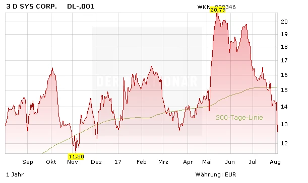 Zwar steht im zweiten Quartal ein Gewinn von 0,08 Dollar zu Buche. Allerdings erwarteten Analysten ein Ergebnis von 0,12 Dollar pro Papier. Auch beim Umsatz hatten sich die 3D-Systems-Anleger mehr erhofft: Rund 159 Millionen Dollar sind einfach zu wenig, um eine nachhaltige Trendwende einzuleiten.