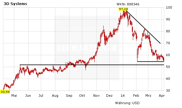 Die Aktie von 3D Systems befindet sich unverändert im Korrekturmodus. Momentan steht der Titel in Höhe einer horizontalen Unterstützung bei rund 52 Dollar. Aus charttechnischer Sicht ist hier eine Gegenbewegung möglich. Etabliert sich diese, so könnte der Kurs in den nächsten Wochen wieder nach oben laufen. Ziele sind dann 61 und später 64 Dollar. Bleibt eine Bewegung nach oben aus, so sind die nächsten Ziele auf der Unterseite zunächst bei 48 und danach bei 41,50 Dollar zu suchen.