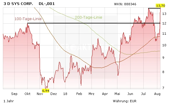 Im Zuge des nachbörslichen Kurssprungs von rund 20 Prozent markierte die 3D-Systems-Aktie im nachbörslichen Handel ein neues Jahreshoch, was zu einem massiven Kaufsignal führen würde. Das Papier muss den Ausbruch jedoch im regulären Handel bestätigen. Inwiefern sich dieser dann als nachhaltig erweist, zeigen die kommenden Tage. Spekulativ ausgerichtete Anleger sollten sich den 3D-Druck-Titel auf die Watchlist setzen.