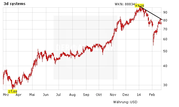Nach dem Absturz wegen der revidierten Prognose hatte die Aktie von 3D System zuletzt wieder Fahrt aufgenommen. Zuletzt meldete 3D Systems eine Kooperation mit dem weltweit agierenden Spielzeughersteller Hasbro. Wie diese Kooperation aussehen wird, ließen die beiden Unternehmen jedoch offen. Nur so viel: Beide Unternehmen wollen offensichtlich vom Netzwerk des anderen profitieren.