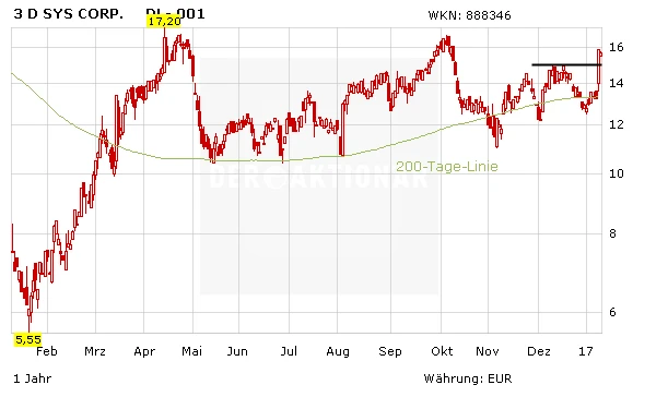 Dank der Übernahmegerüchte konnten sich die Papiere von 3D Systems deutlich von der 200-Tage-Linie nach oben absetzen und notierte damit so hoch wie seit dem Oktober 2016 nicht mehr. Mutige Anleger legen sich eine Position mit Stopp ins Depot.