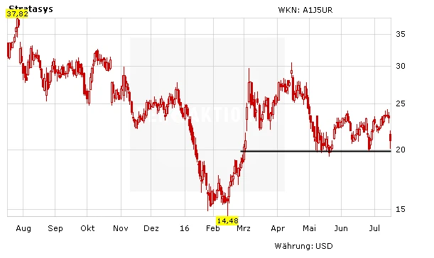 Endgültige Gewissheit erhalten die Anleger am 3. (3D Systems) und am 4. August (Stratasys). Dann legen die beiden Unternehmen ihr Zahlenwerk zum zweiten Quartal vor. Charttechnisch sollten Anleger bei Stratasys die 20-Dollar-Marke im Blick behalten. Dort verläuft eine wichtige Unterstützungszone. Wird diese unterschritten, sollten Anleger die Reißleine ziehen.