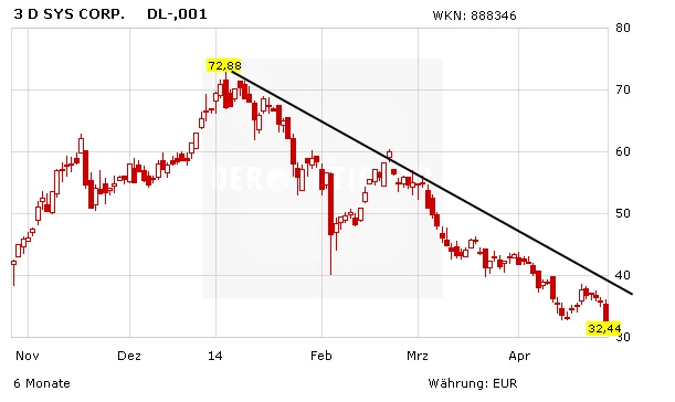 Die Aktie von 3D Sytems hat eine Achterbahnfahrt hinter sich. In den Jahren 2012 und 2013 stieg der Titel um knapp 900 Prozent. Seit dem Hoch am 3. Januar 2014 ging es aber nur noch bergab. Inzwischen hat sich die Aktie im Wert mehr als halbiert und ein Ende der Talfahrt ist noch nicht in Sicht. Die nächste Unterstützung ist bei rund 30 Euro zu finden. Eine Ausweitung der Korrektur bis in diesen Bereich muss einkalkuliert werden. Sollte der Titel allerdings vorher über die Marke von 39 Euro ansteigen, eröffnet sich neues Aufwärtspotenzial. Ein mögliches Ziel wäre dann bei rund 55 Euro zu finden.